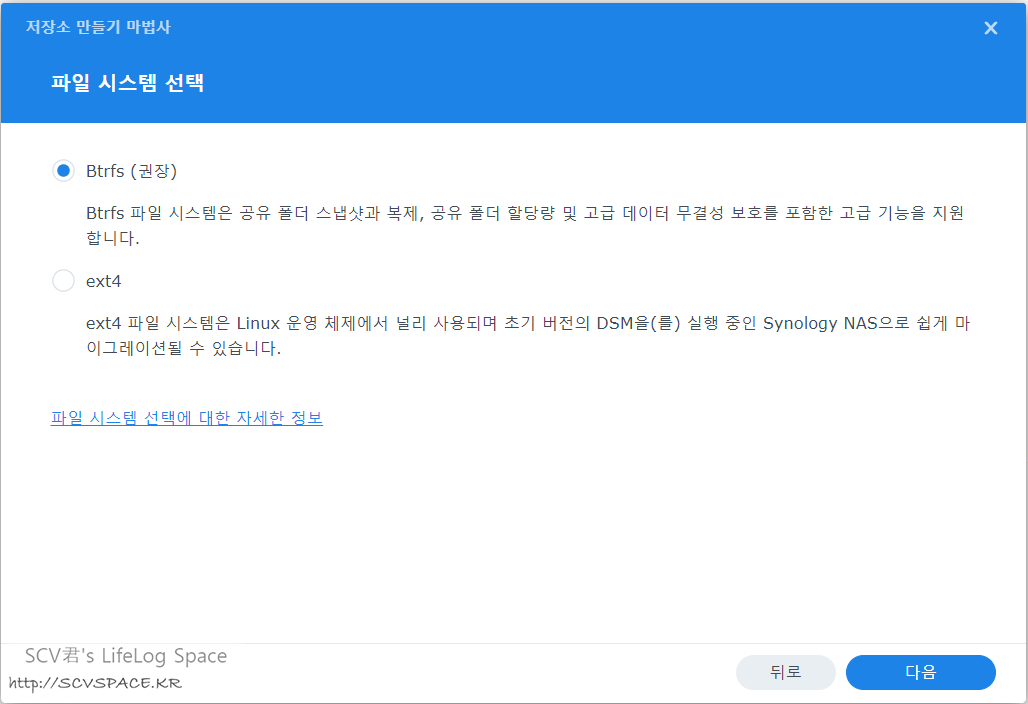 여긴 보급형(보다는 살짝 상위 모델이려나요) 에 가까운 모델이라 메인NAS처럼 Btrfs 파일시스템이 지원되진 않습니다.