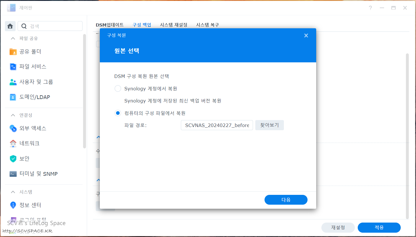 - DSM 설정: 공유폴더, 계정, 제어판 설정정보 등 이걸로 많은 번거로움이 줄어듭니다.