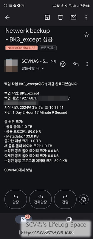 왼쪽은 기다리고 기다려서 받아낸 백업작업 완료결과 안내메일. 1TB 백업하는데 꼬박 하루가 걸린 겁니다.