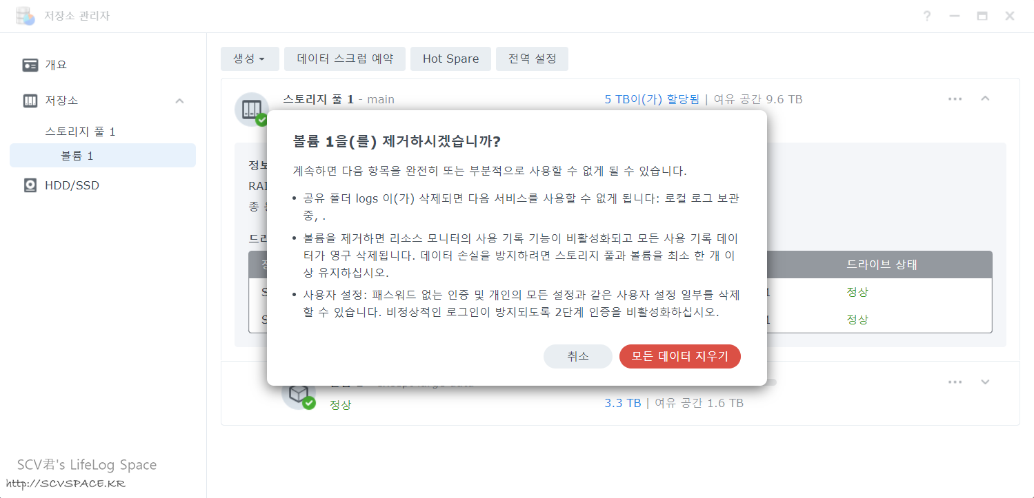 백업NAS는 백업 용도로만 쓰기 때문에 안에 들은건 백업데이터와 아카이브된 로그 뿐입니다. 그래서 겸사겸사 볼륨 제거로 초기화 결정.