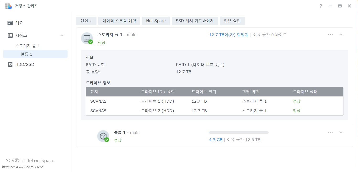 초기설정하고 NAS 에 진입하면 거의 바로 스토리지 풀과 볼륨을 만들어야 합니다.