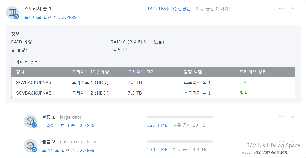 백업 NAS의 경우는 기존에 쓰던 HDD를 RAID0(합치기) 로 붙혔습니다.