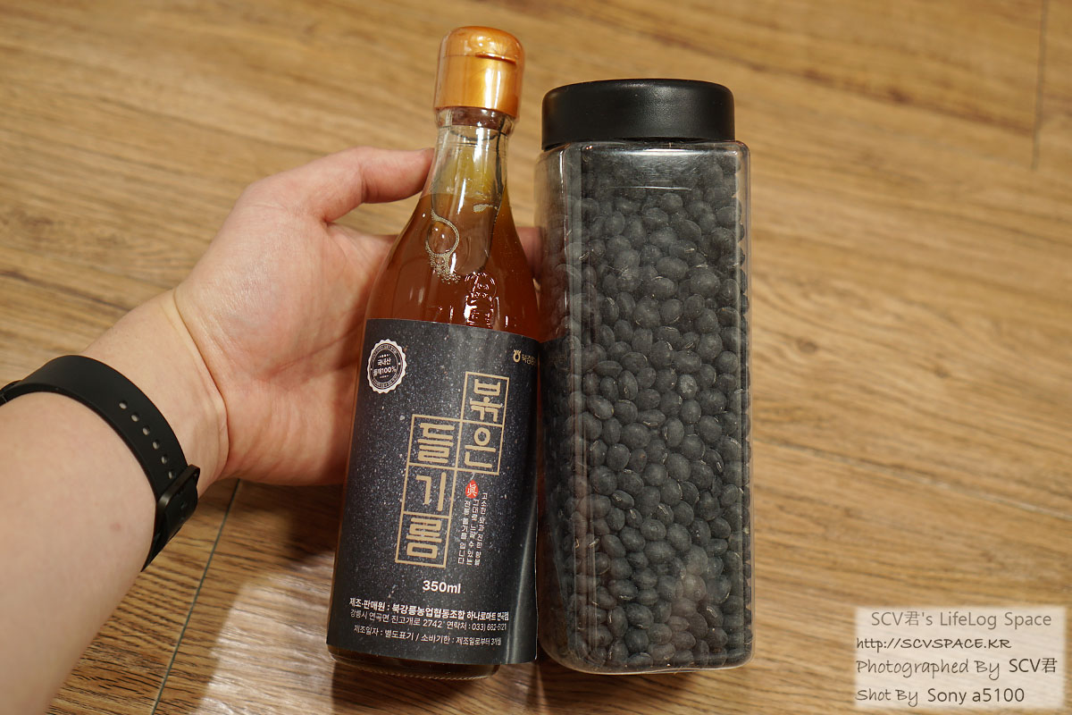 사진에는 들기름만 있었는데, 막상 열어보니 들기름과 함께 들기름 병만한 검은콩도 따라왔구요.