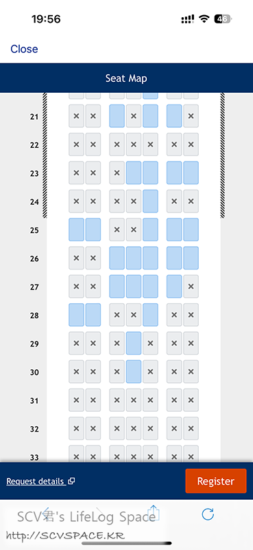 사실 위 이미지에서 보시다시피 앞자리 창가가 거의 없어, 웹 체크인(출국 24시간 이내)때 창가자리가 얼마나 남아있을까 싶었습니다.