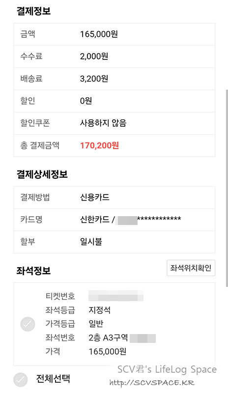 그리고 다시 7초 이내로 좌석선택 페이지로 진입했고, 그 시점에서 이미 처음 진입한 왼쪽에서 B구역은 자리가 없어서 A구역 뒷줄 쪽의 남은자리 하나 겨우 찍어서 넘어갔구요.