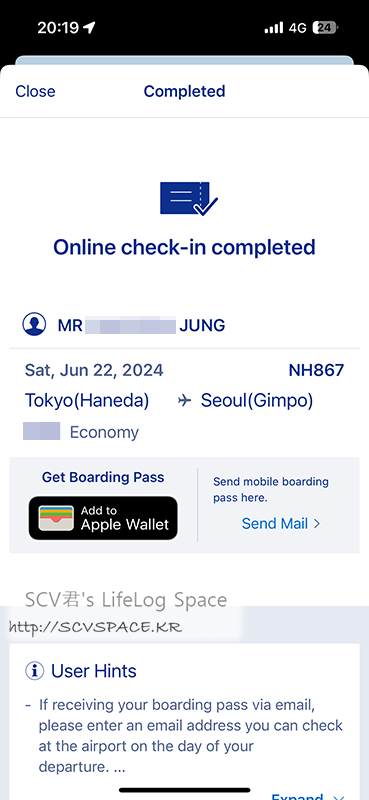 출발편은 김포 출발이라 모바일 탑승권이 안나왔는데, 귀국편은 하네다 출발편이라 모바일 탑승권이 발급됐습니다.