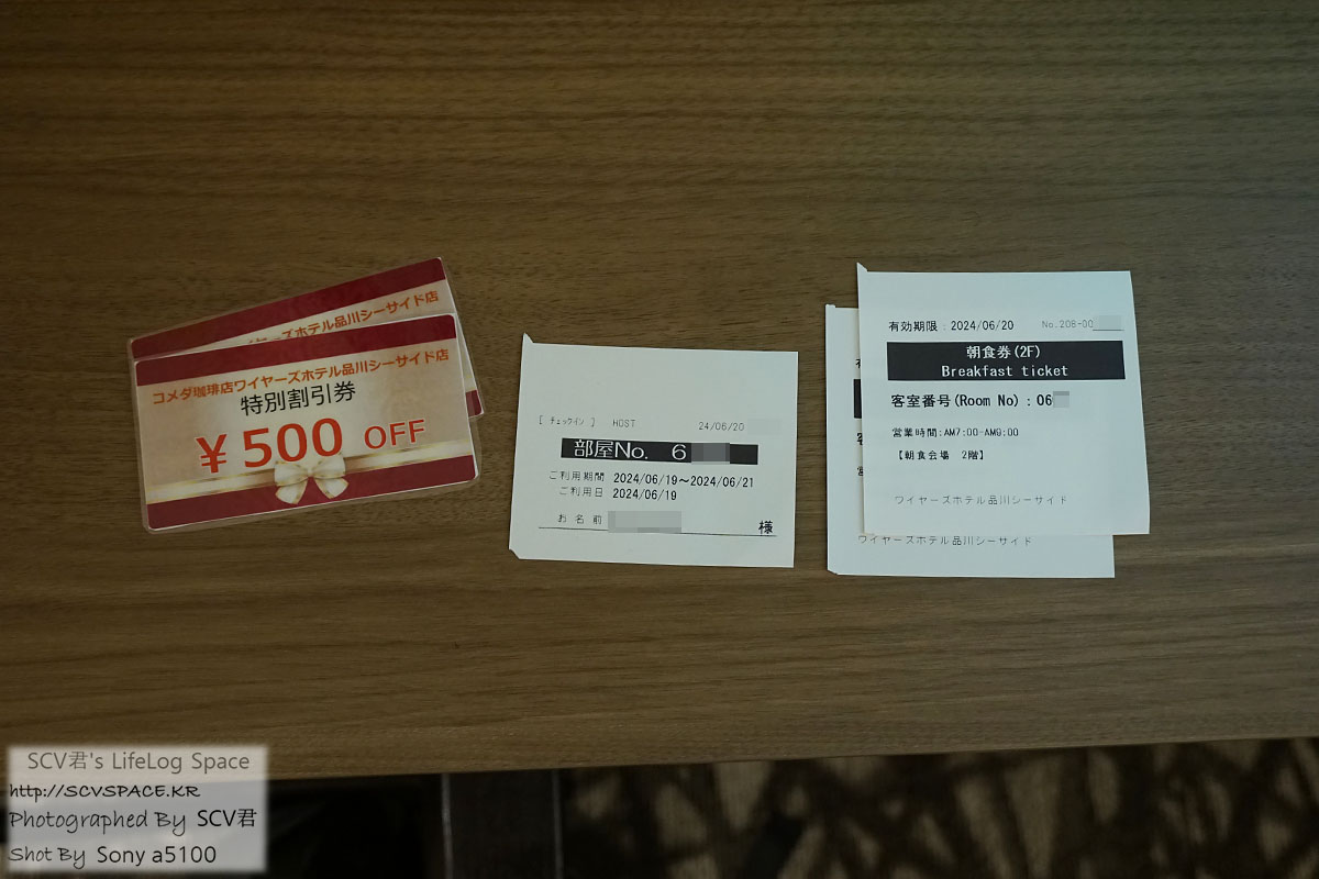 플랜상 포함된 조식 식권 두장, 영수증, 코메다 500엔 할인쿠폰.