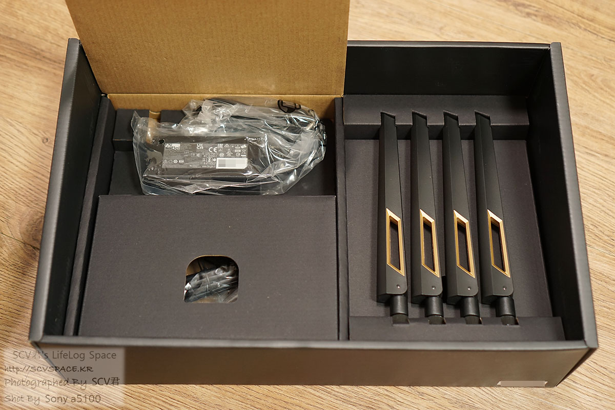 본체 아래에는 예비 케이블(Cat.6 규격) 과 전원 어댑터, 본체 부착용 안테나 4개 정도가 더 들어있습니다.