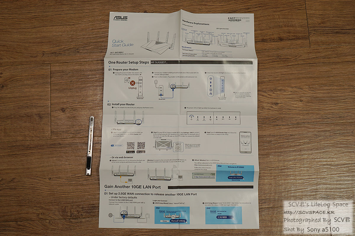 오른쪽 본체 옆의 커터칼은 크기 비교용 박스를 열면 바로 보이는건 고객센터 연락처와 빠른설정 가이드 같은 인쇄물.