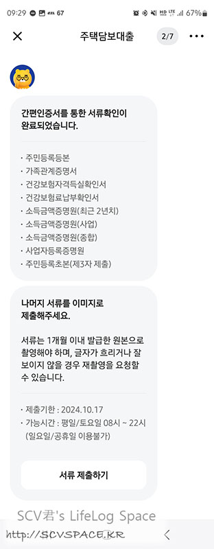 한도도 확인할 겸 14일에 한도조회를 하고 '대출하기' 를 눌러서 외부기관 연계를 수행해뒀는데, 일단 이걸 해놓으면 서류제출 대기 상태가 되어 10/16일 정도에 서류를 제출해도 11/4일에 대출이 나오는거죠.