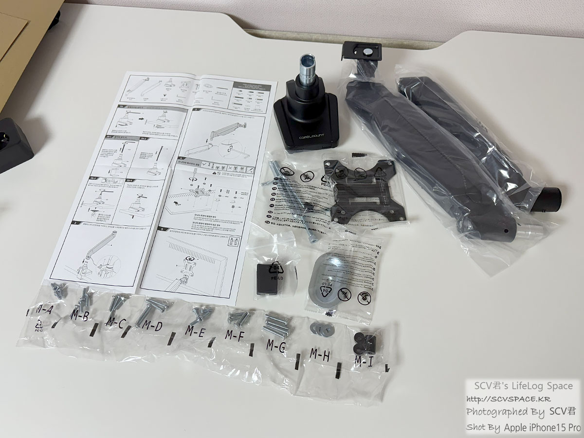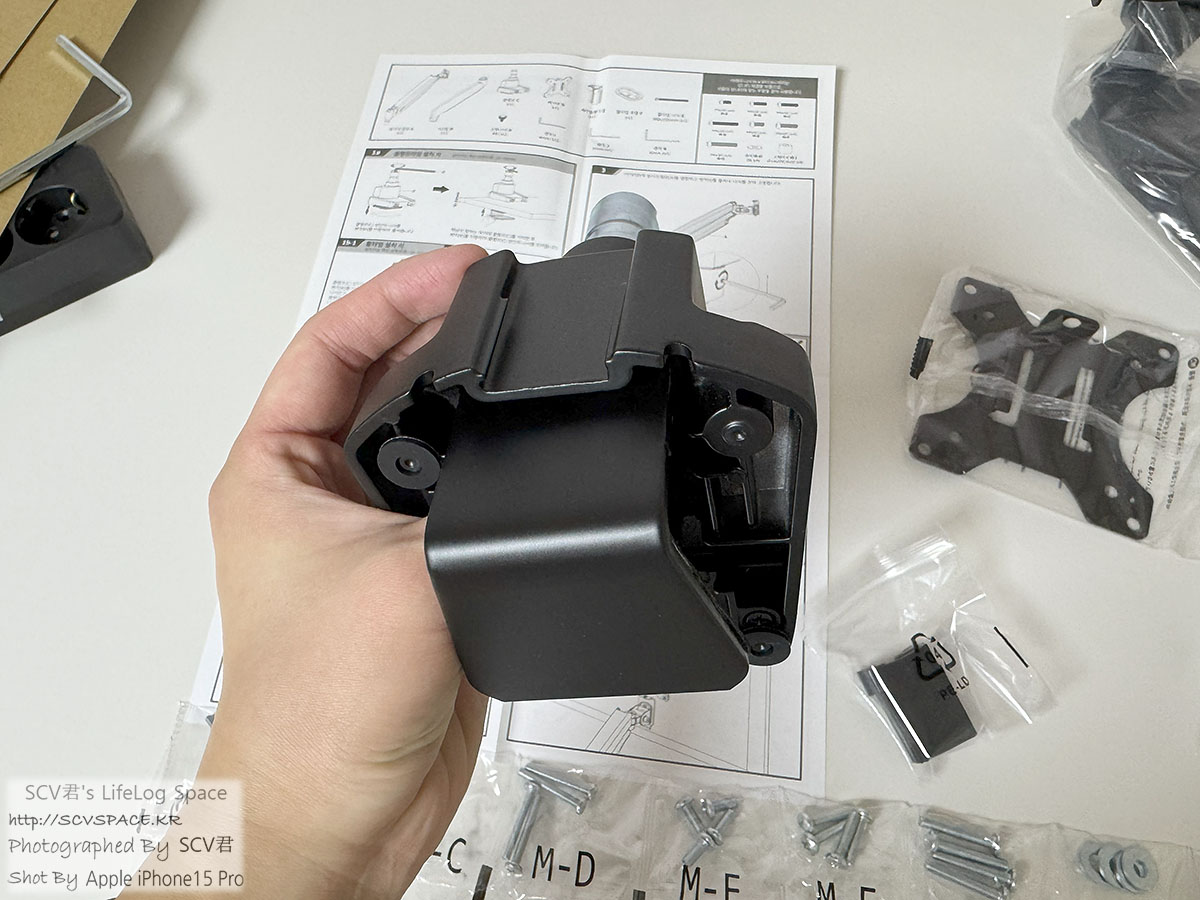 구성품은 이렇습니다. 책상 마운트와 모니터 브라켓, 모니터암 자체 빼면 나사가 절반인 느낌.