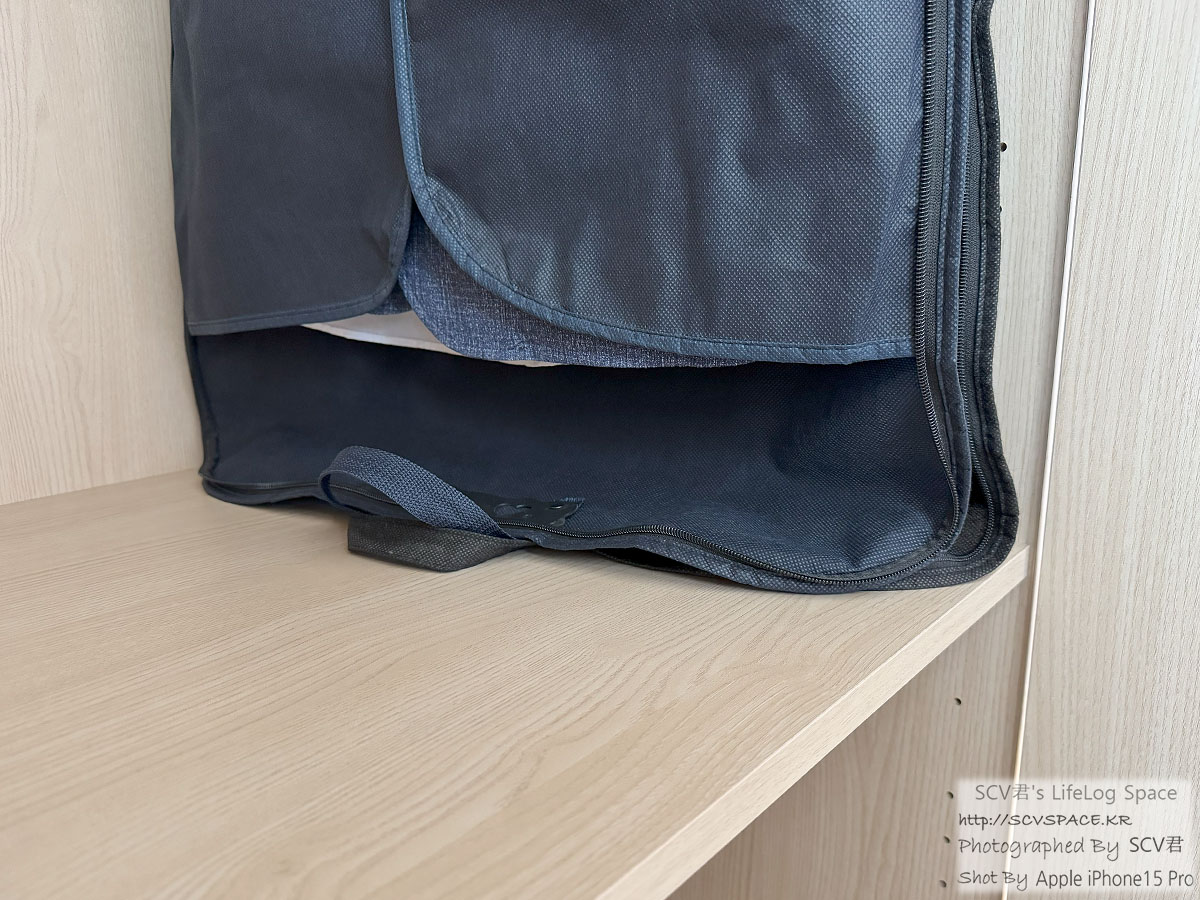 위쪽에는 주로 양복을 걸고 아래쪽에는 이불, 베개 여분을 쌓아두는데 쓰고 있는데, 위쪽 양복 걸었을때의 여유공간 참고차.
