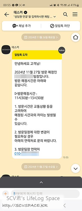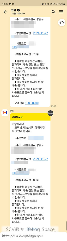 배송일이 가까워지면 전날에 한번 방문예정 시간대가 안내되고, 다음날은 30분 이내에 배송기사 방문 직전에 알림톡이 오더군요.