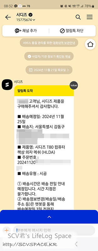 시디즈의 경우도 전날 밤에 주문했더니 다음날 오전에 구입 관련 알림톡이 왔구요.