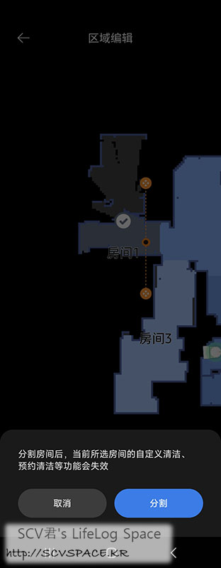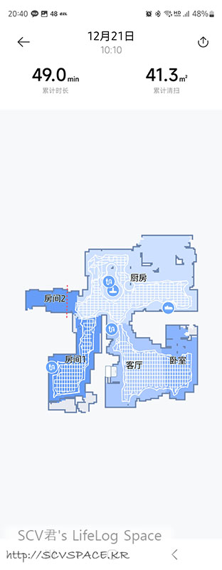 위의 흰 선이 로봇청소기가 다닌 흔적이고, 청소중일 때 열면 궤적이 실시간으로 업데이트되며 보여지구요.