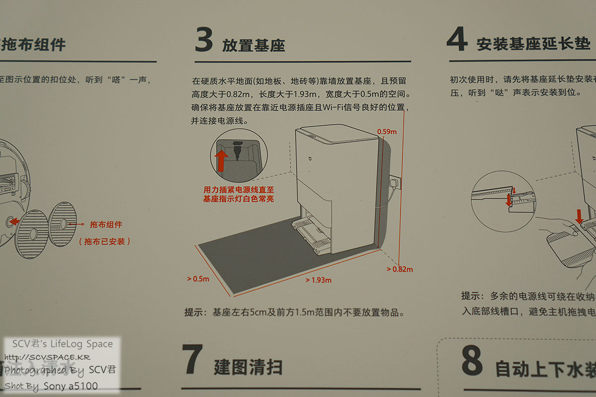 스테이션 크기는 저렇답니다. 앞쪽은 로봇청소기가 들어가고 나가는 통로라 또 공간이 있어야 하고.