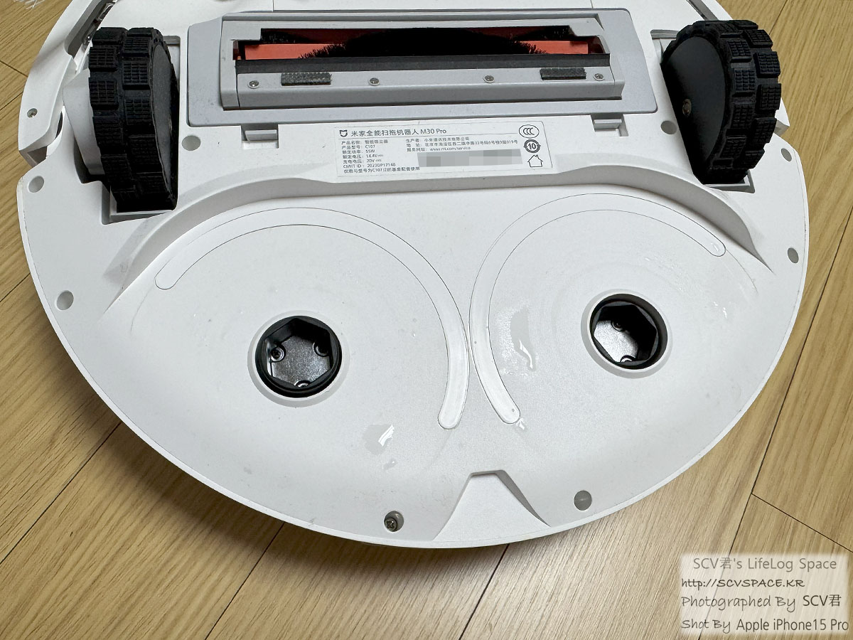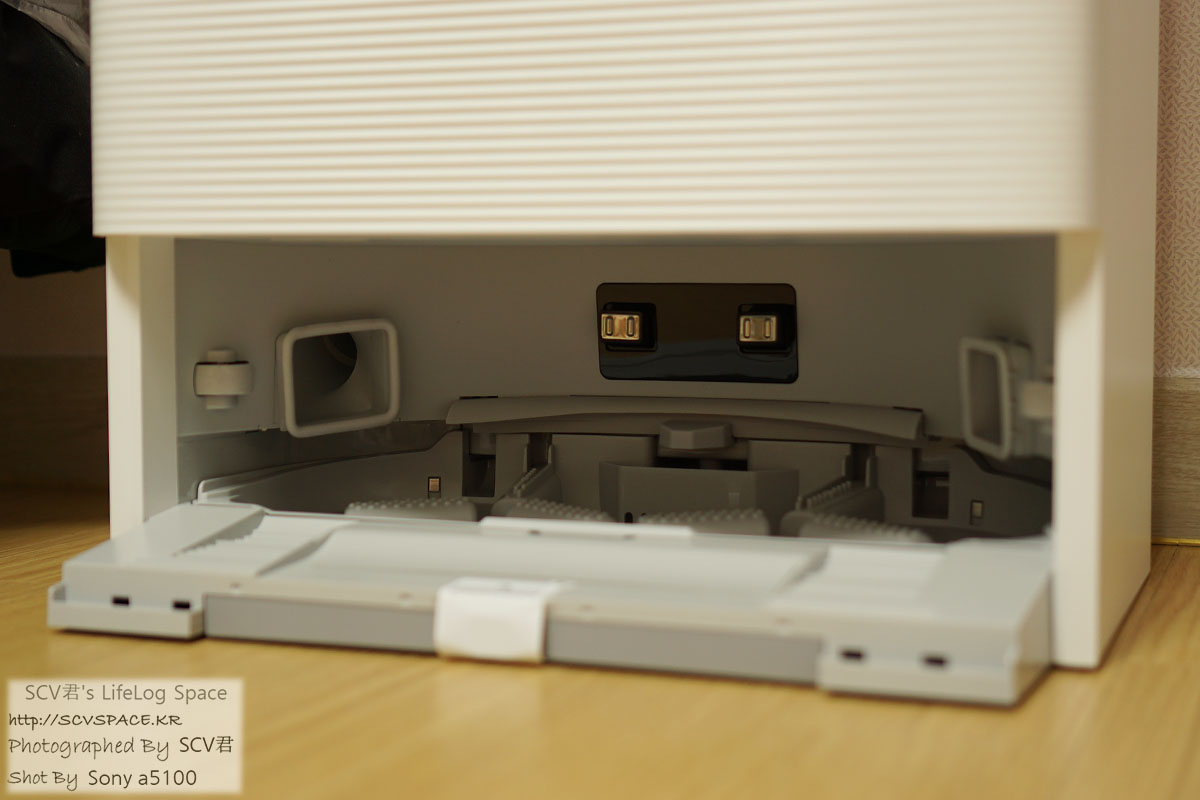 안쪽을 좀 들여다보면, 충전하는 단자나 본체에서 먼지 뺄 구멍(좌우), 걸레 청소하는 부분(아래) 같은게 보입니다.