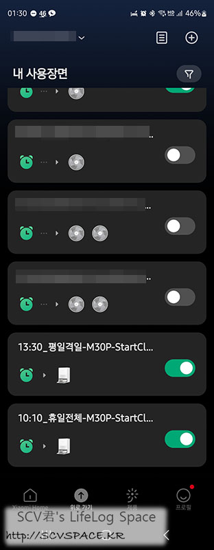 샤오미 미홈 앱에서의 스케쥴 설정도 다른 기기(제 경우는 먼저 사서 쓰고있는 서큘레이터 등) 처럼 설정이 가능합니다.