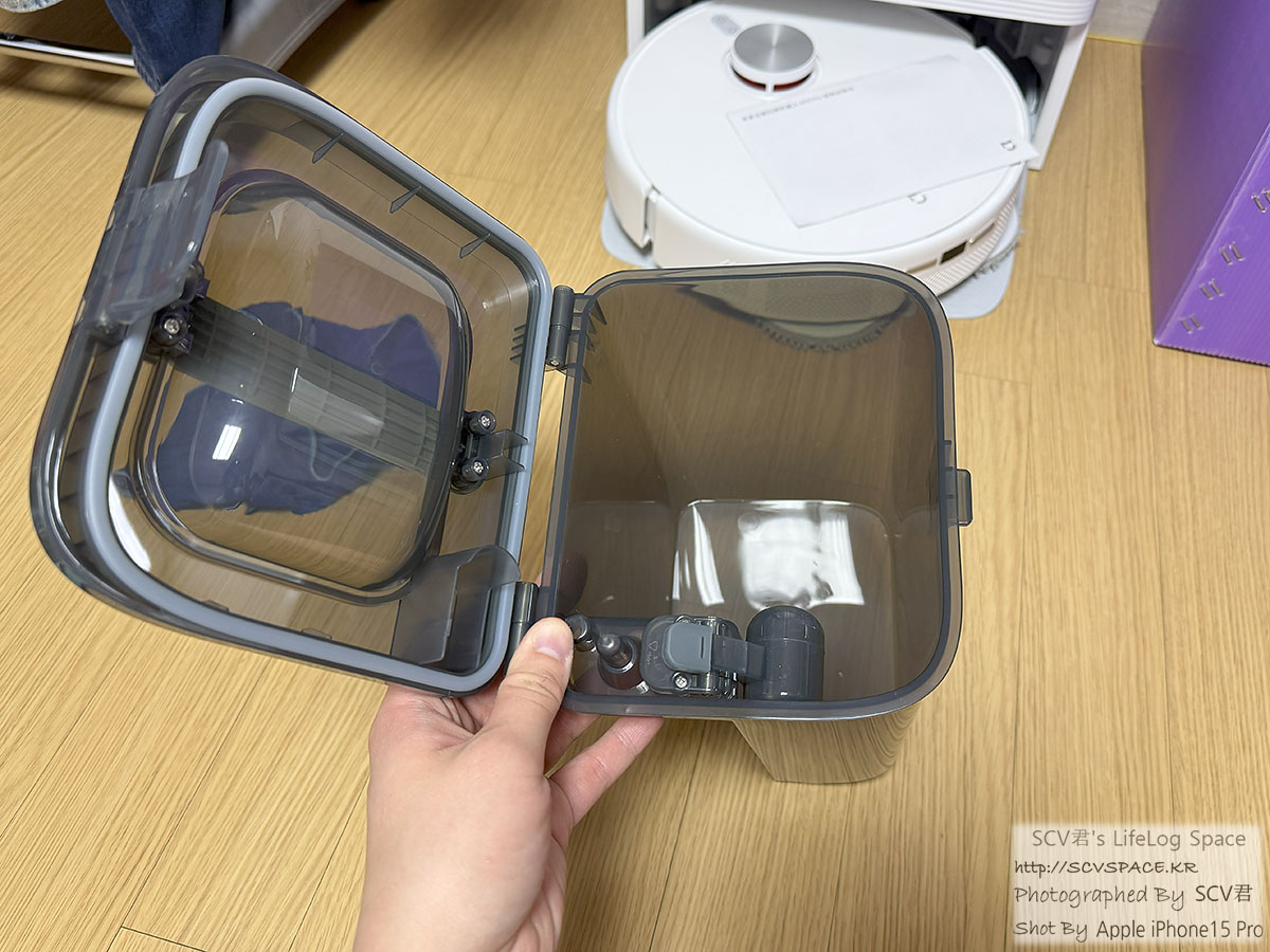 로봇청소기가 1차로 걸레질 전에 흡입청소를 하고 돌아오면 스테이션이 로봇청소기 내 먼지를 빨아들여 여기에 저장합니다.