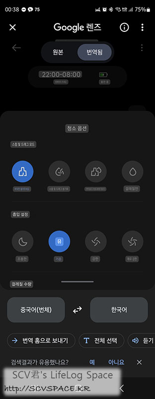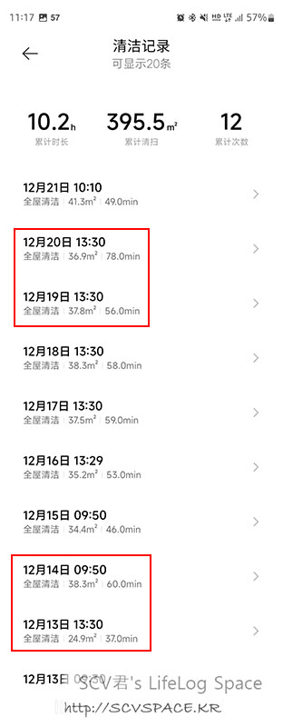 오른쪽 위의 상세 메뉴를 통하면 과거 청소이력도 확인할 수 있구요.