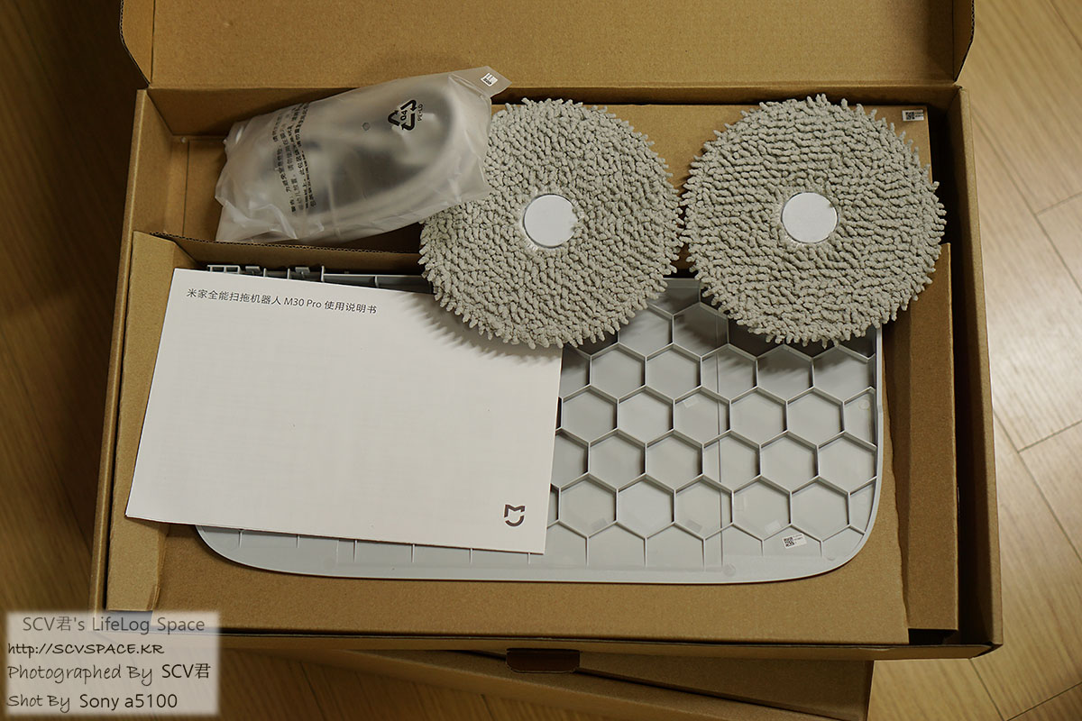 설치 설명서(종이), 로봇청소기에 붙히는 걸레, 스테이션에 붙히는 로봇청소기 입구 경사로나 전원케이블.