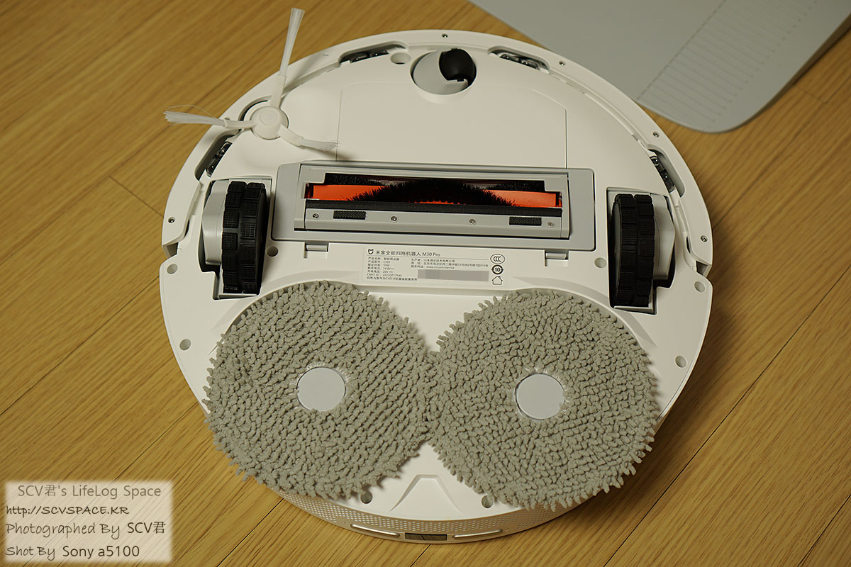 본체에 붙은 원형 걸레가 돌기 위에서 회전하며 걸레 세척이 되는걸로 추정.