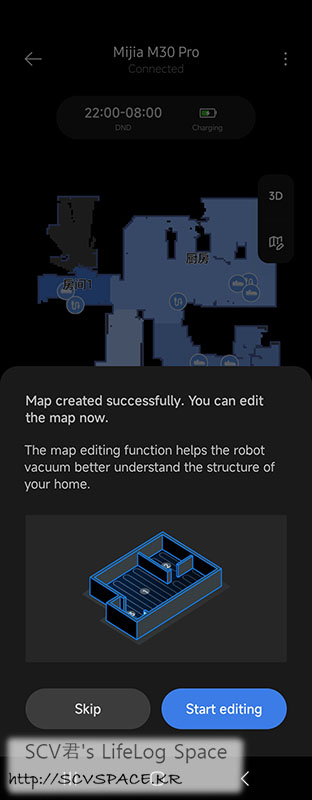어차피 이렇게 실내지도를 그리기 전에는 로봇청소기 본체를 스테이션에 가져다 두라고 하니, 미리 두시는걸 추천.
