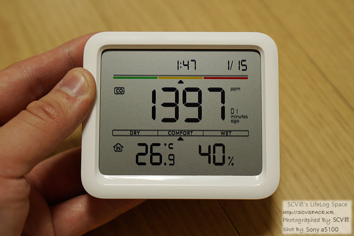 이산화탄소 측정 센서의 경우, 건전지 모드에서는 30분마다, USB 전원입력 모드에서는 최대 1분( 5분 권장) 마다 측정치 확인 가능.