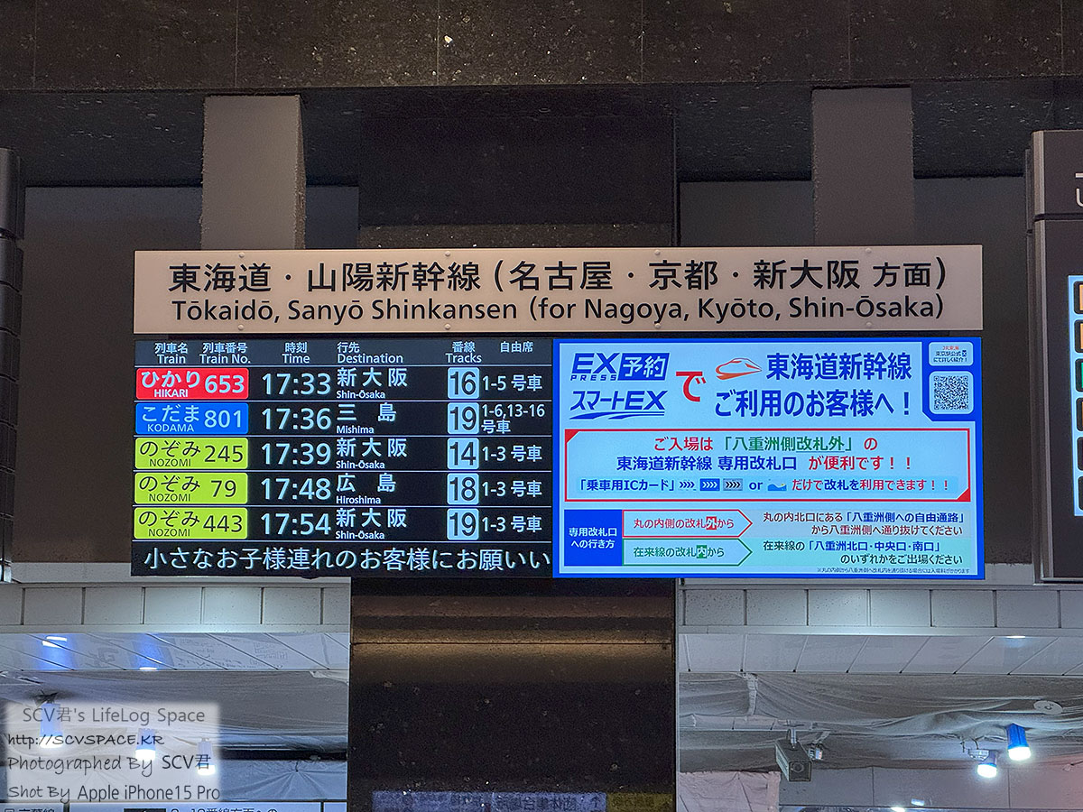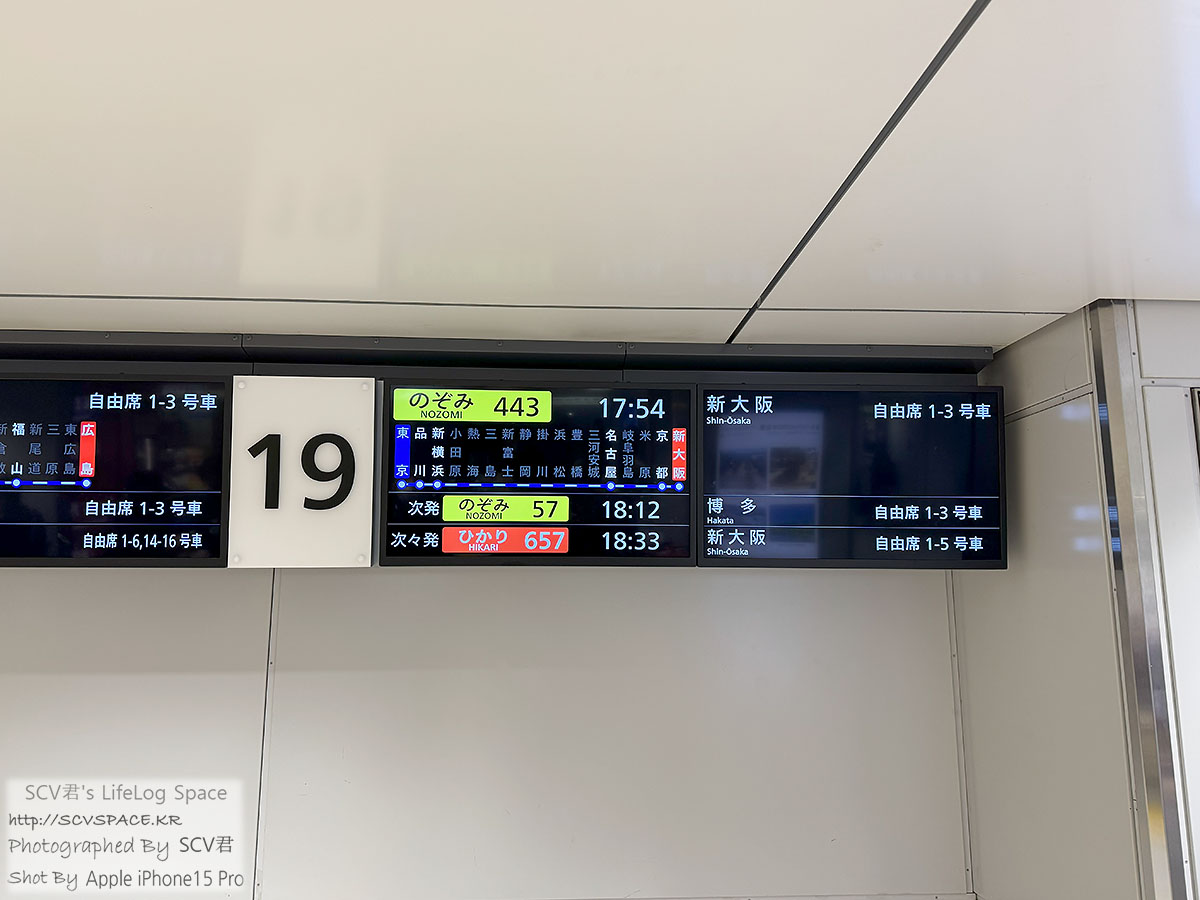 혹시나 해서 안내판에서 신칸센 출발시간 체크해보니 맨 아래 노조미 443호 17:54 출발 잘 보이네요.