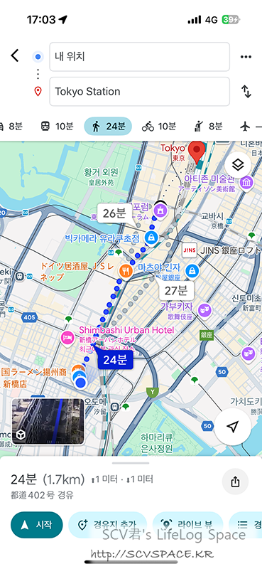 호텔 들렀다가 도쿄역까지 가는 길이 마침 대중교통상으로도 애매하길래, 걸어서 이동하게 계획 짰네요.