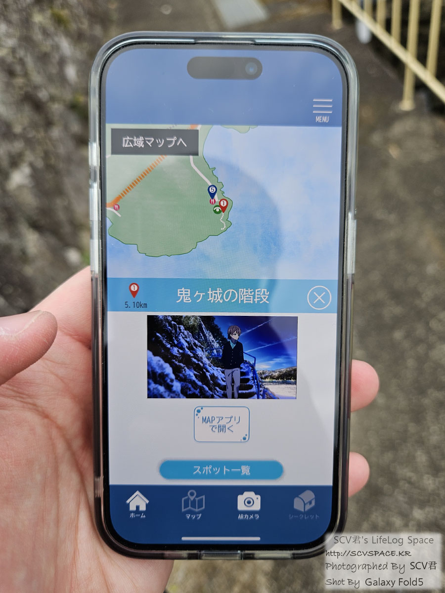 공식 성지순례 앱에서 위치를 찍어보면 작중의 풍경이 이런식으로 보여집니다. 이런 설정을 그리는 모태가 되었다네요.