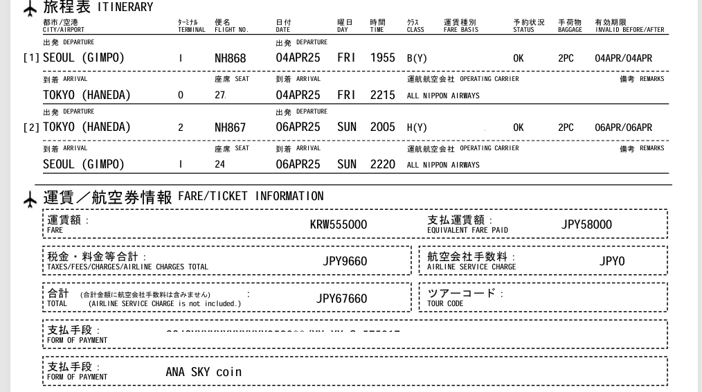 일정은 4/4(금) 19:55 출발, 4/6(일) 20:05 출발, ANA 김포-하네다편을 67,660-1,130= 66530엔에 샀다는 이야기.