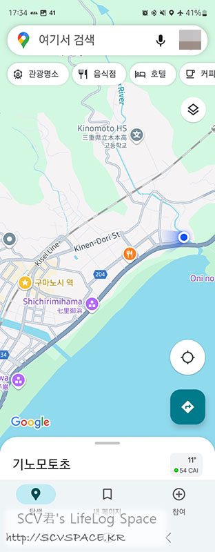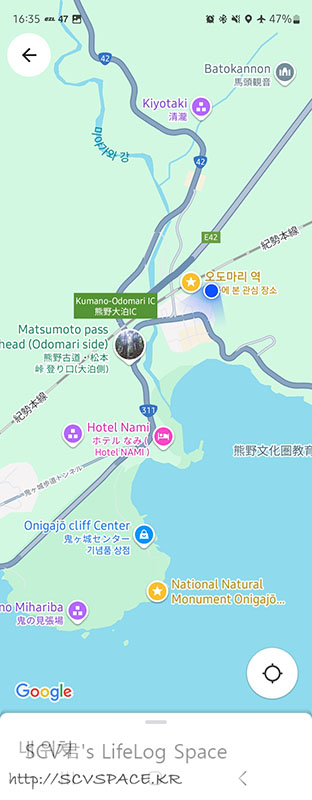 다음 목적지는 오니가죠(鬼ヶ城) 라고 위 이미지 하단에 찍힌 노란 즐겨찾기 쪽에 있습니다. 꽤 걸어야 되죠.