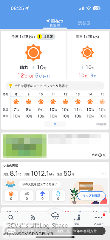 한편, 그늘져서 춥다는 생각이 들 즈음 한국 날씨도 궁금해졌습니다.