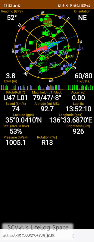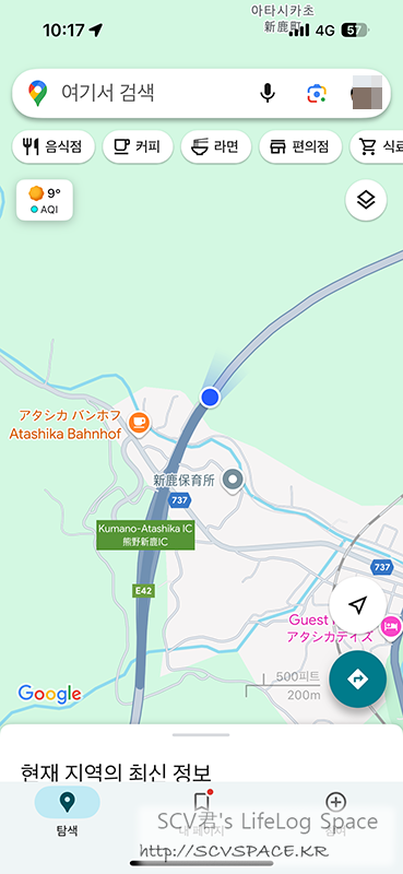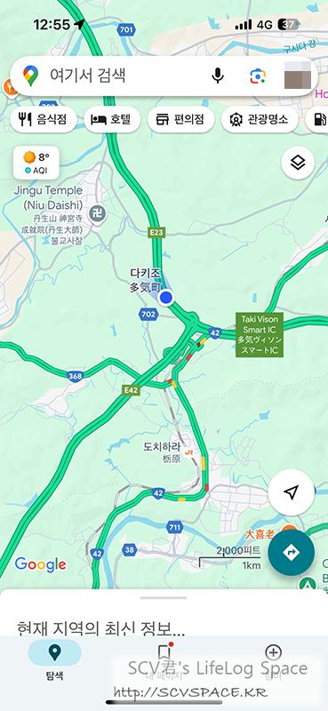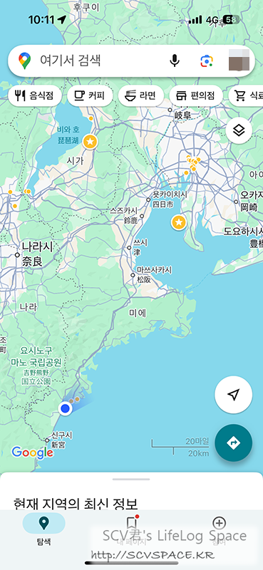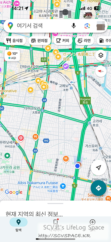 현재 위치가 왼쪽 아래에 파란 점으로 있는데, 사진 오른쪽 위의 노란색 많이 모인 지역이 나고야입니다.