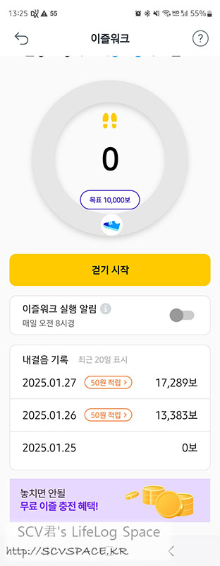 그리고 위 화면에서 걷기시작 버튼을 누른 후, 측정되는 '단말 자체의 도보값'만을 측정해 5천보 이상이면 10원, 1만보 이상이면 50원을 줍니다.