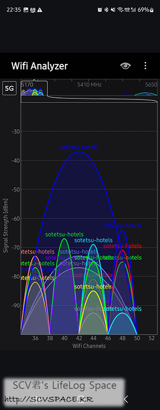 오른쪽이 5GHz 대역의 신호인데, 다행히 호텔 신호 말고는 별로 안보이지만 아닌 곳도 5GHz 대역까지 있으니 불편하지 않게 쓰겠지요.