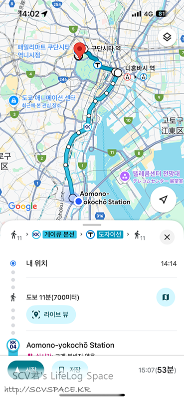 근데 막상 내려서 지도앱을 보니 직전역인 구단시타에서 내리는게 도보로는 더 빠르지 않았을까 싶어 아쉽더군요.