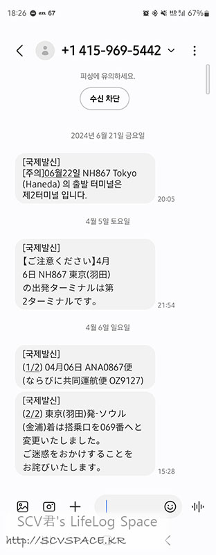 이때 사진찍고 찍힌 사진 보다가 ANA에서 문자 보낸걸 이제 발견.