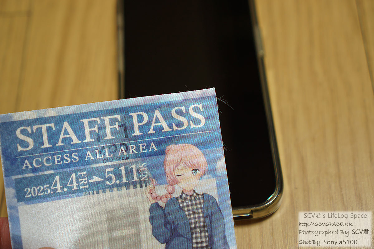 넓은 티켓모양 아크릴판이 사전예약 특전, 다른 한쪽이 전체 입장자에게 증정되는 STAFF PASS 풍 스티커.