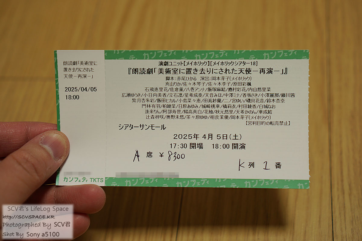 이건 둘째날, 개최 정보만 가지고 당일권 사서 감상한 낭독극 '미술실에 남겨진 천사' (美術室に置き去りにされた天使) 재연 공연의 팜플렛과 티켓.