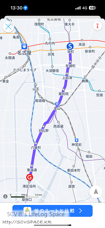 참고로 전체 경로는 오른쪽과 같습니다. 역도 그렇게 많지 않은데 늦은 시간이라고 중간에 갈아타게 하네(...)