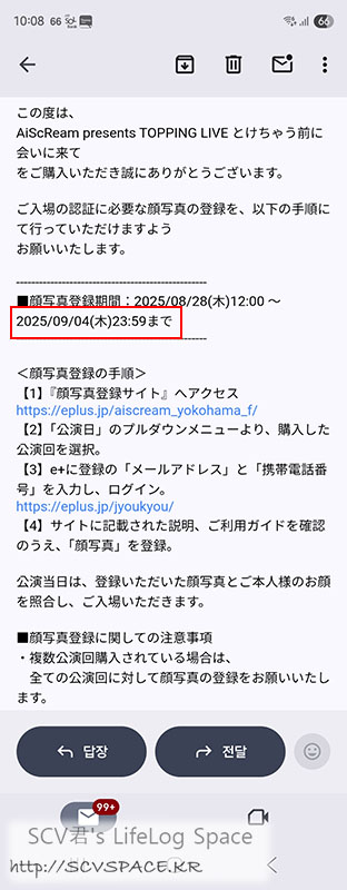 러브라이브 이벤트에 이플러스 티켓 가지고는 첫 입장이었는데, 말로만 들었던 '안면인식' 을 위한 얼굴사진 등록 안내가 8월 말쯤 왔었습니다.