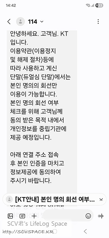 그 이후, 듀얼심 기기의 정책상 본인인증이 필요하다며 KT에서 안내문자가 와서, 포함된 링크로 접속해 온라인으로 절차를 끝냈습니다.