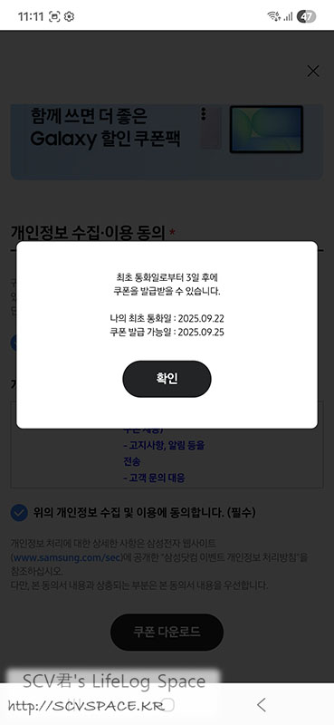 삼성멤버스 앱을 통해 S25 FE 특전 페이지로 접근해서 제대로 개통일이 인식되는 것 확인.