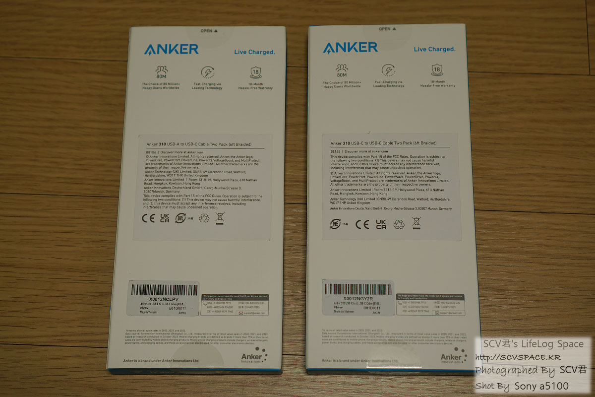 Anker USB-A to USB-C, USB-C to USB-C ケーブル (한박스 2개입) 1,490엔 [아마존 USB-A to C, 아마존 USB-C to C]