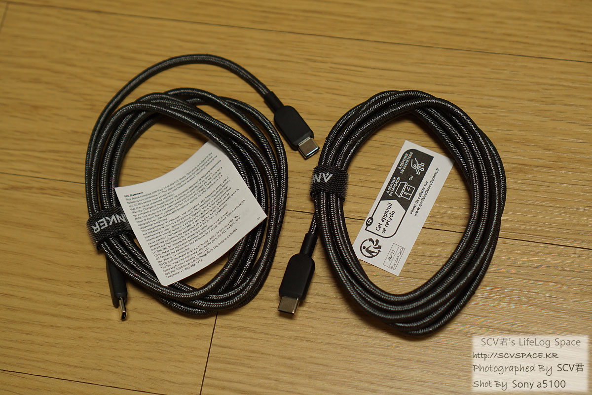 왼쪽이 USB-A to C, 오른쪽이 USB-C to C 열면 이렇게 나일론 피복의 케이블이 두개씩. 각 길이 1.8M
