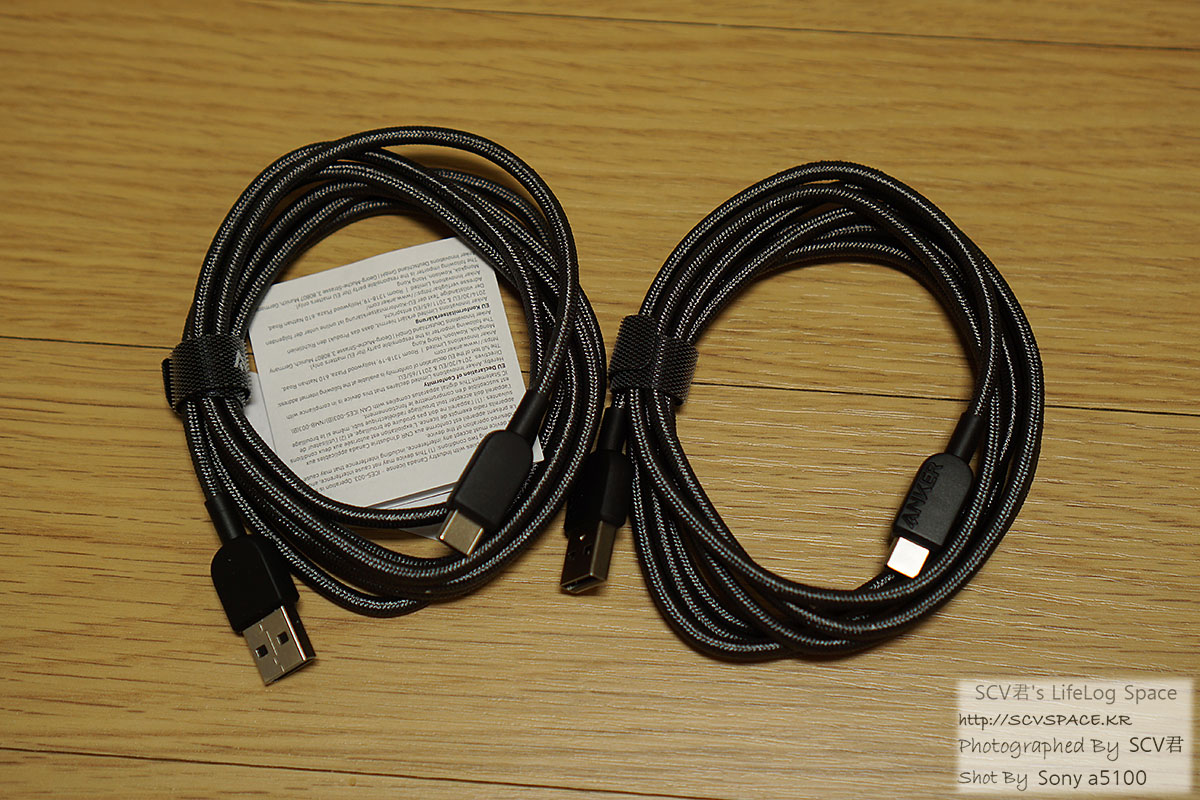 왼쪽이 USB-A to C, 오른쪽이 USB-C to C 열면 이렇게 나일론 피복의 케이블이 두개씩. 각 길이 1.8M