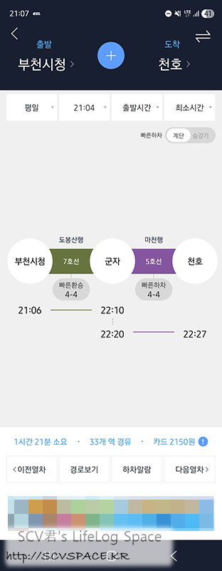 단지 루트가 집으로 바로 가는게 아니라 회사에 두고온 물건 찾으러 가는 경로가 되어서.. 환승하고 나니 1호선이네요.