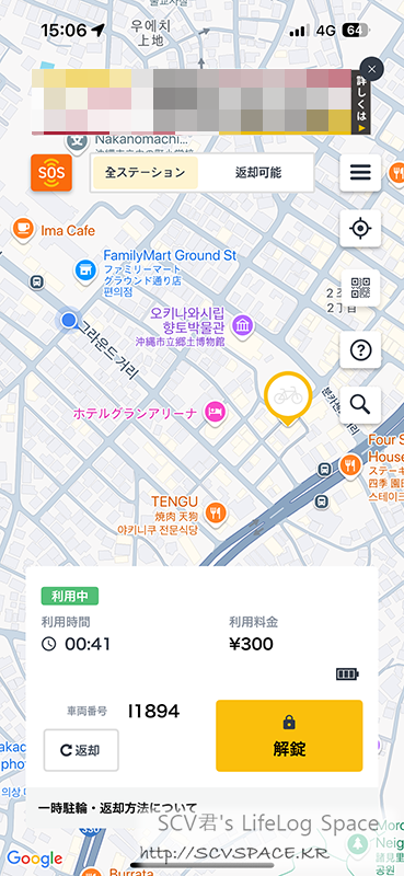 결국 가까운 곳까지 돌아가는 중. 다행히 딱 45분째에 반납해서 300엔 냈습니다만... 아 이거 참 지랄맞은 여행이 되겠구나.